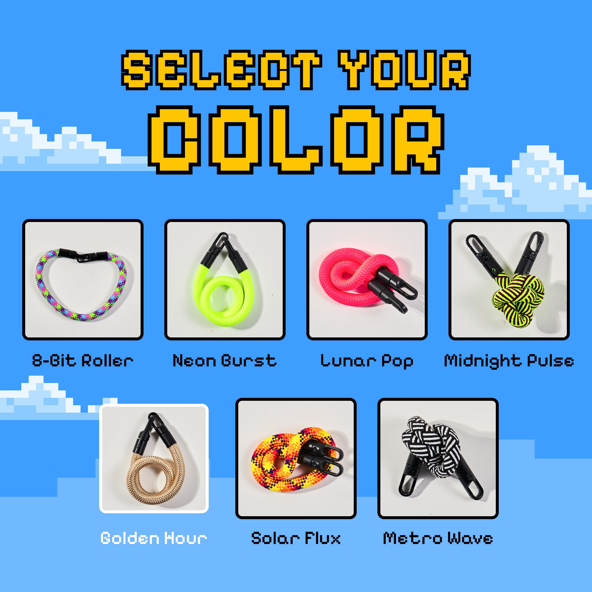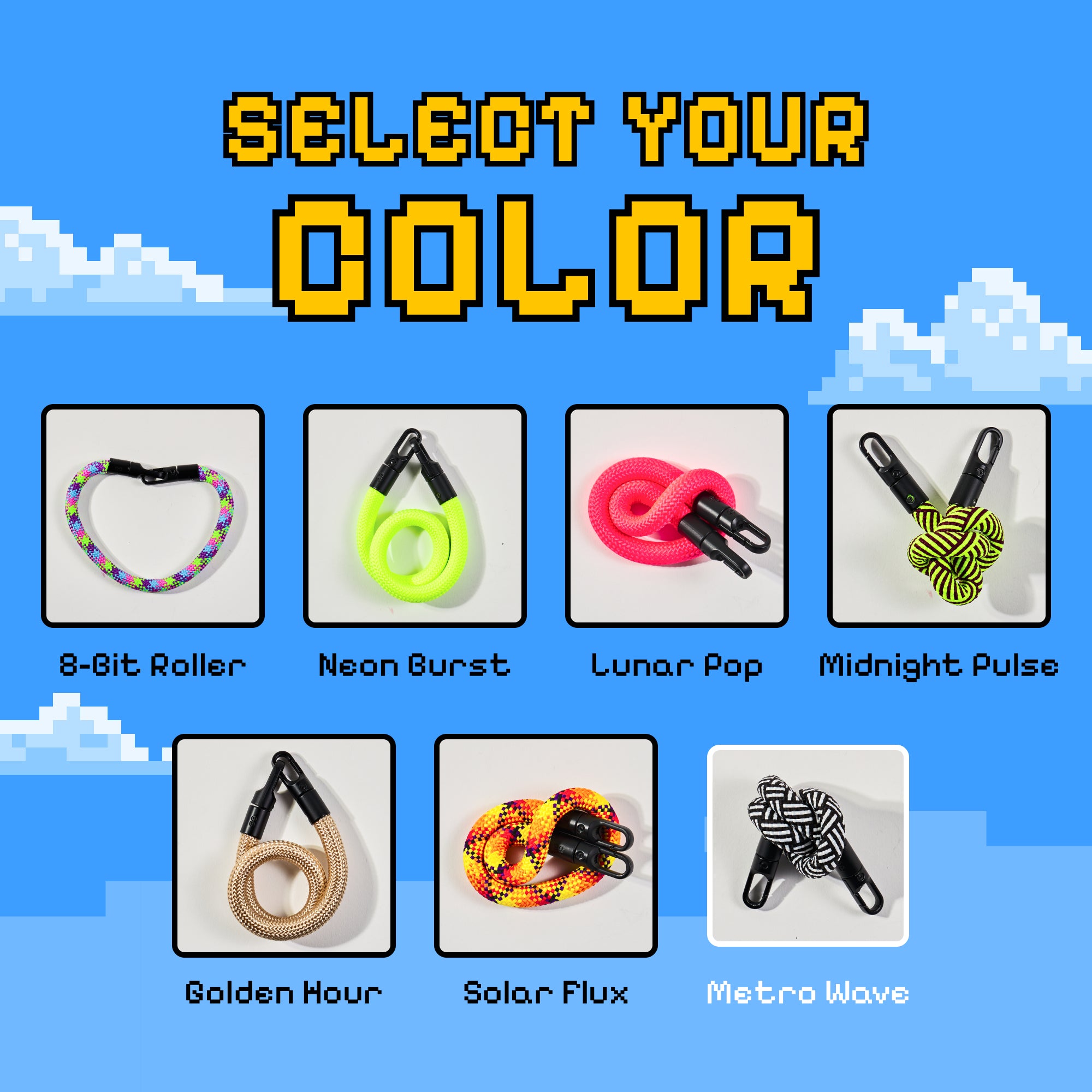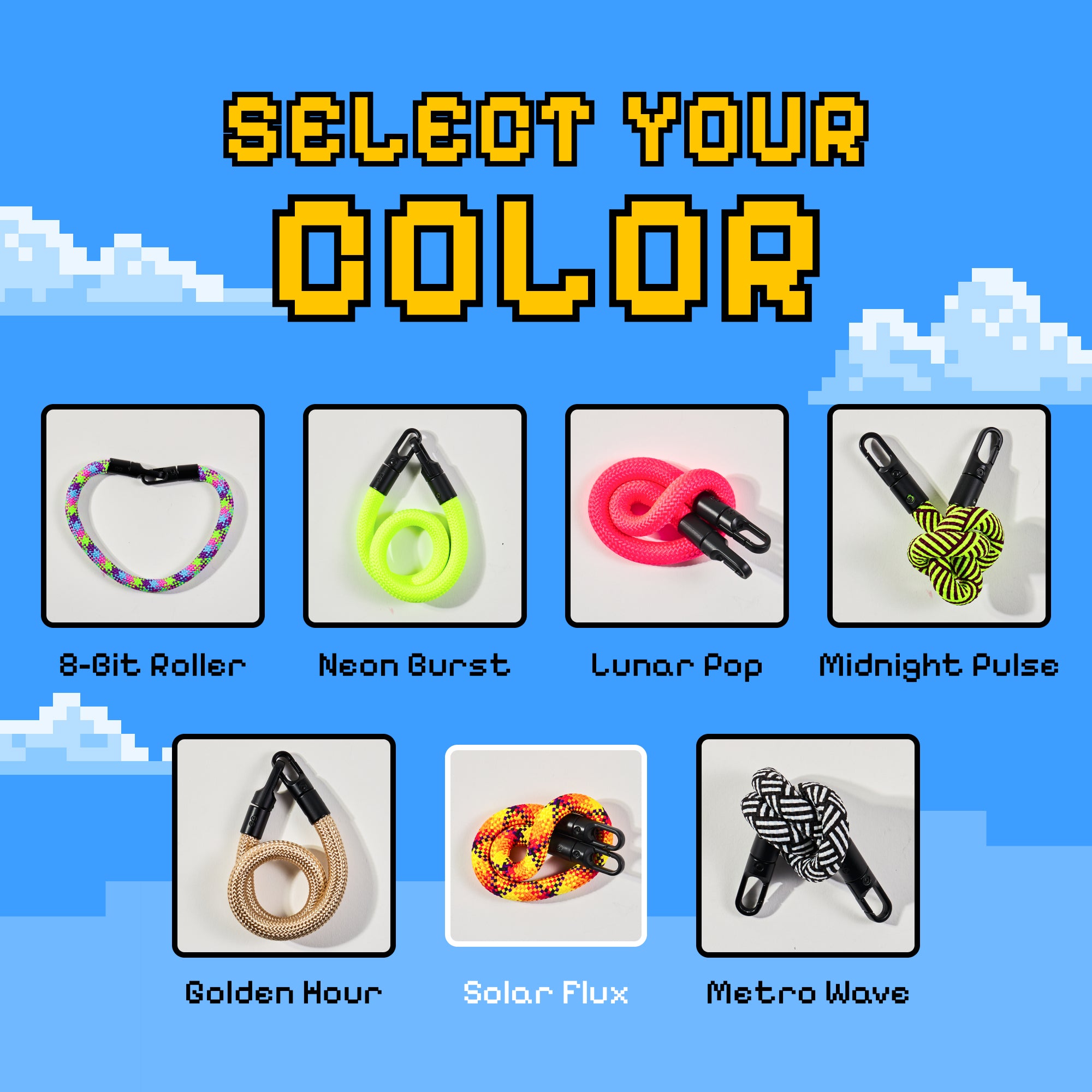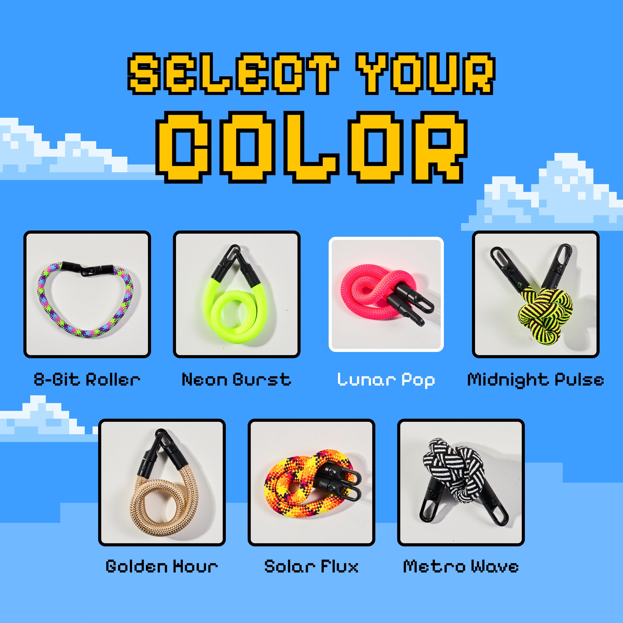Available in bold colorways like Neon Burst, Lunar Pop, 8-Bit Roller, Midnight Pulse.